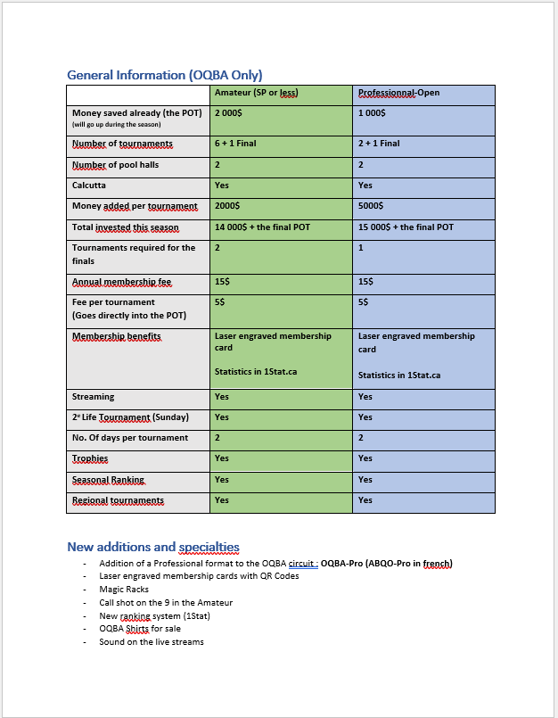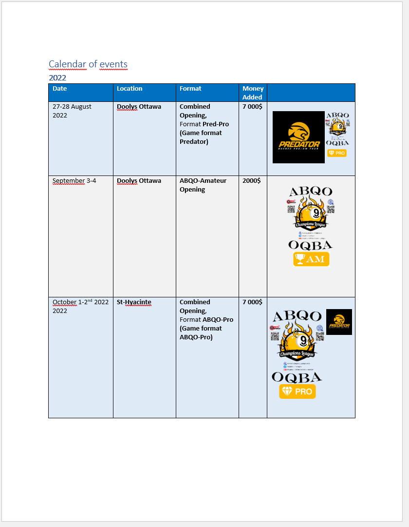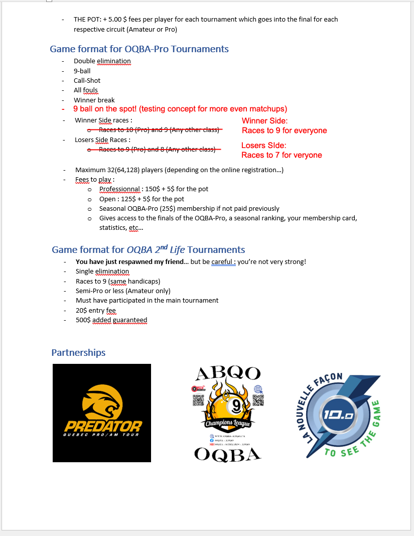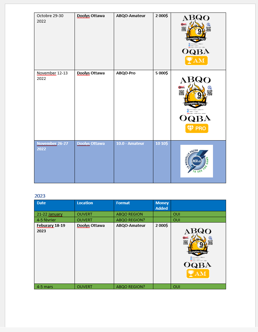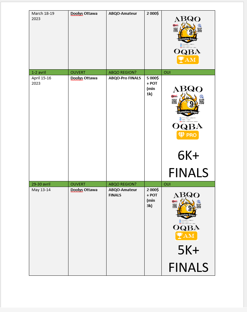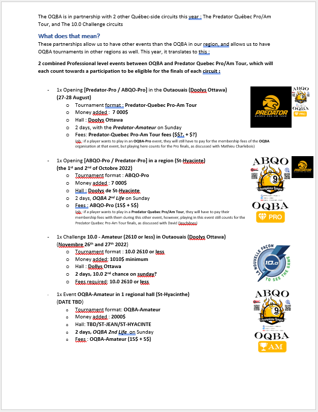 Note that some of the items here could be changed, like venues, but in the same regions, mostly for the partnerships with Predator Quebec Pro-Am Tour, and the Le Challenge 10.0.