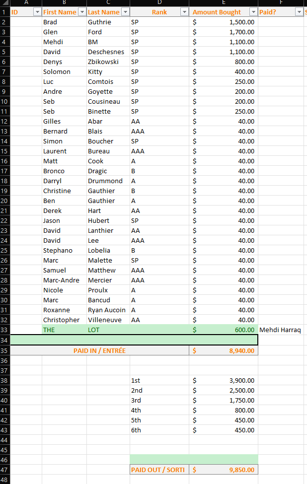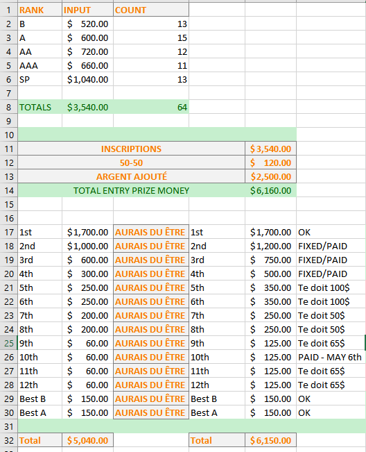 Please see the list below, and if your name shows up as owed/in red, please contact Mathieu Charlebois or Jason Hubert to get your due.