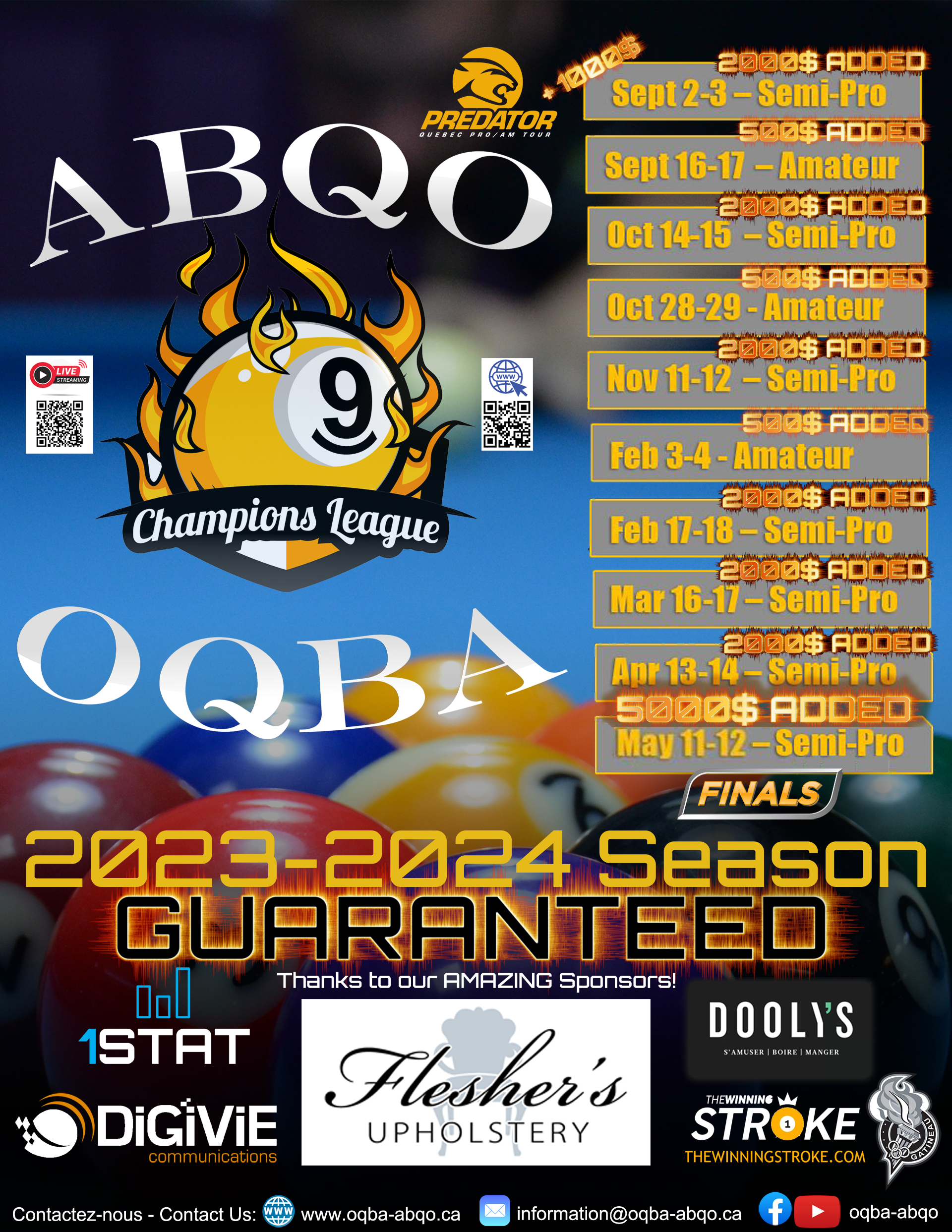 Thanks to a partnership between our generous sponsors Fleshers Upholstery and OQBA Streams ABQO, we are proud to announce that there will be more than 1 000$ added to the April 30th tournament, as well as another 1 000$ or more added to our finals on May 21st! :) As well, thanks to these sponsors, we have more than 7 000$ saved for next season’s tournaments, including a minimum of 2 000$ added to our finals! Join us and register to play today! The April 30th tournament is your last chance to qualify for the finals: