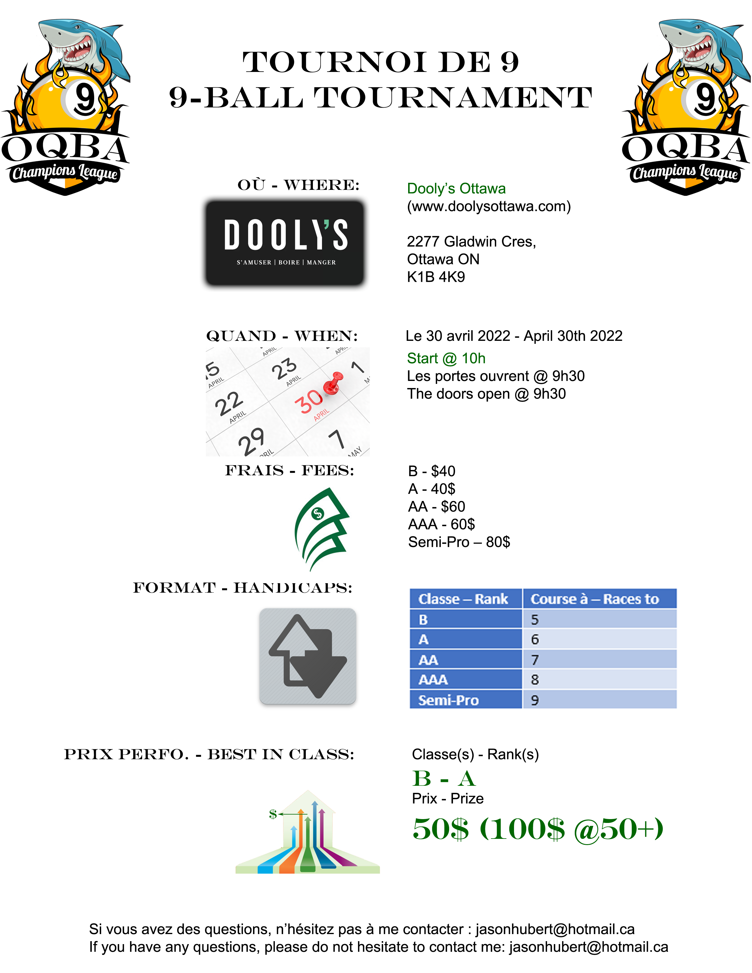 During the April 30th tournament, we will have access to the mezzanine at Doolys Ottawa! As well, for our finals of this year, all of the tables will be refelted with new carpets! A big thank you to Ras Jamani, Jay and all of the team at Doolys Ottawa for making this possible and supporting our circuit!